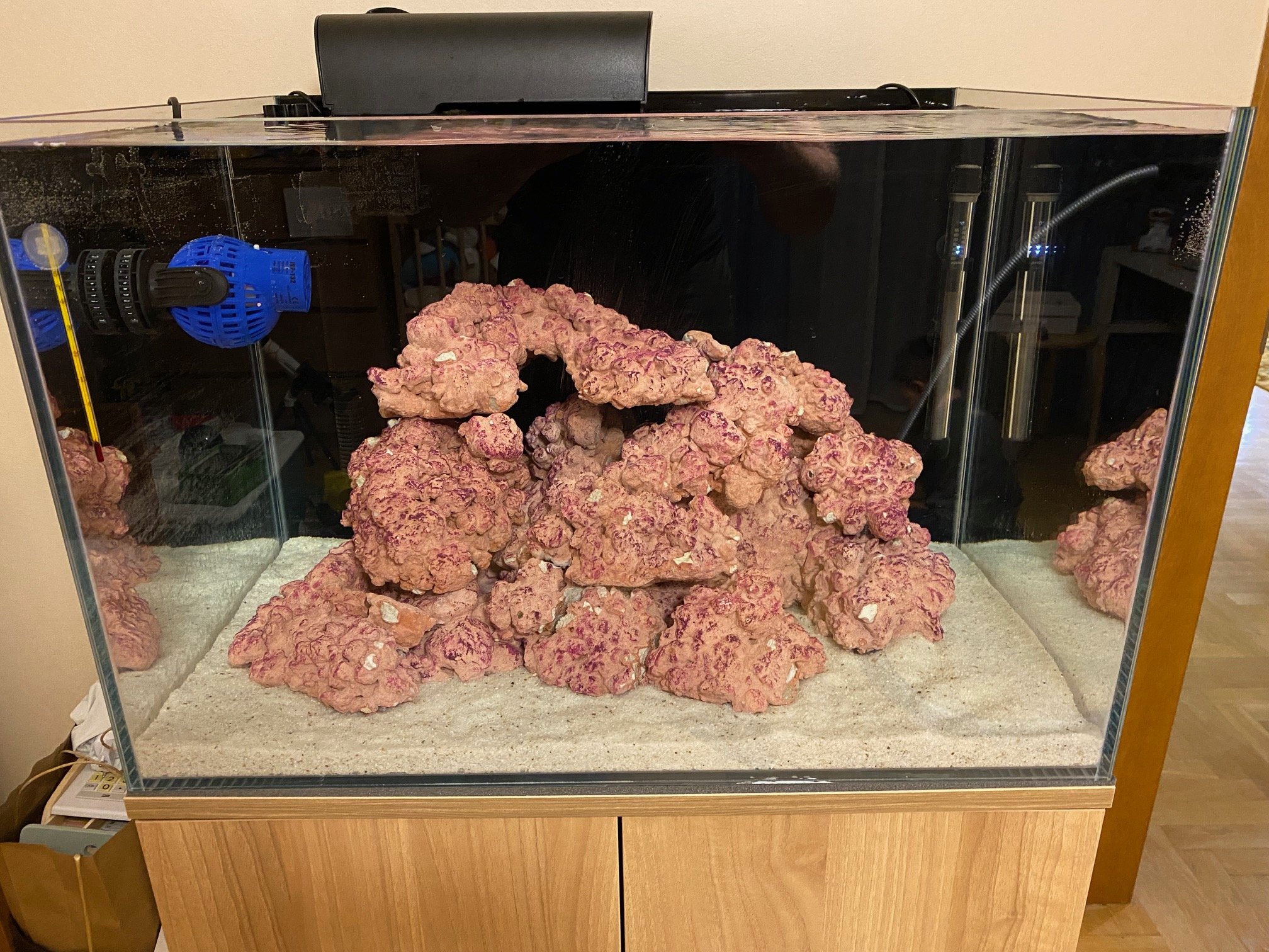 Tak, wygląda 1 dzień po zalaniu. Zrobiłem drobne poprawki. Odsunąłem boki od szyb tak jak mówiliście żeby było miejsce na czyścik. Skały ułożyłem tak żeby były 3 poziomy, nie wiem czy zdjęcie to oddaje ale przez to powinno być więcej miejsca na korale bo można je układać na samej górze na środkowych skałach i na dolnych (takie balkoniki). A uważacie że powinienem odjąć trochę skały? W sumie tą górną skałę która tworzy ten tunel to mógłbym ewentualnie się pozbyć. Konstrukcja będzie bardziej płaska i niższa.