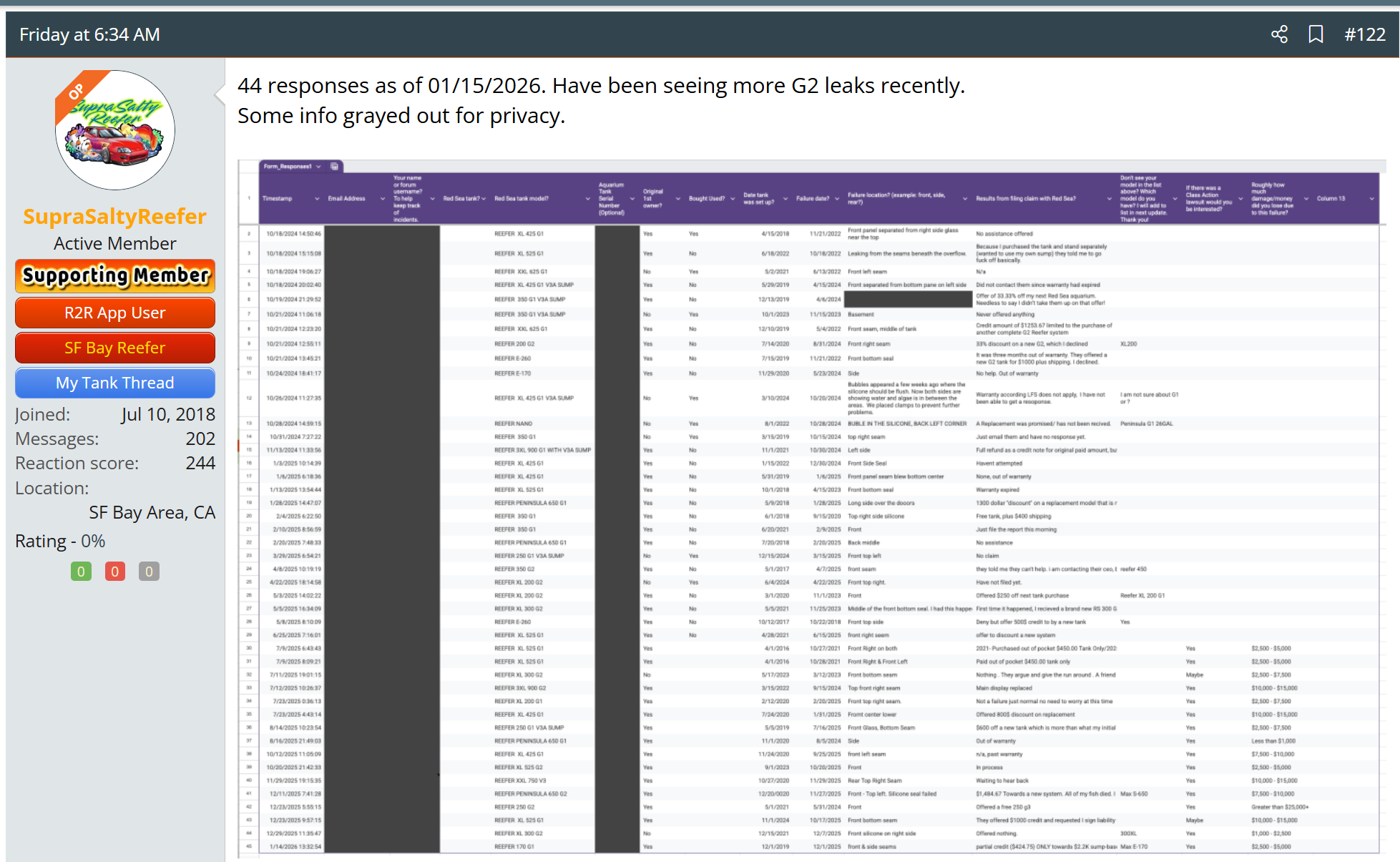 VDR Zgłoś Napisano Środa o 23:08 @Opelin widzisz bo to jest tak, że zaraz zlecą się fanboye, którzy będą wypisywać, że ich akwarium stoi juz 2 lata czy tam 3. Zapewne u wielu stoją też te G1 wiecej niz 2-3 lata i nic sie nie dzieje. Ale u innych się dzieje czego jesteś niestety przykładem, tak jak i @Kirzan. Nie chce mi się dyskutować i szukać konkretnych tematow. Wrzucam pierwsze lepsze z brzegu z r2r - a jest tego po roznych forach cala masa. Jak ktoś przeglada reefcentral, r2r i pokrewne to nie jeden raz trafił. https://www.reef2reef.com/threads/redsea-peninsula-650-leak-issues-after-4yrs.1075232/ https://www.reef2reef.com/threads/red-sea-tank-fails-again-any-recommendations.981468/ https://www.reef2reef.com/threads/emergency-tank-failure-red-sea-reefer.1078545/ I można by tak ciagnać. Taki super produkt, że na jednym z większych for anglojęzycznych powstał wątek do zgłaszania incydentów i formularz Google Doc przez 2 lata nazbierali 44 przypadki. G2 też tam są - dane sprzed paru dni @ArturNano proponuję żeby się z tym wątkiem zapoznał - tam znajdziesz swoje ukochane G2 na liście. A przecież w tych statystykach nie ma jak sądzę - ani Kirzana, ani Opelina, ani innych, którzy latali na szmacie i zbierali wodę z podłogi. https://www.reef2reef.com/threads/red-sea-aquarium-failure-incident-tracker.1078631/page-7#post-14119187 To też pewnie trolle internetowe wygenerowały: https://www.trustpilot.com/review/redseafish.com Opinia o tych zestawach nie wzięła się znikąd Cytuj 110x50x50 ,sump 62.5x38x40, 3x Tunze 6045, nj4500, H&S 150-F2001 Dariusz 'VDR' Rubinkiewicz http://nano-reef.pl/topic/35493-275l-radomskie-malenstwo/ http://art.debesciak.net http://www.klub-malawi.pl Udostępnij tę odpowiedź Odnośnik do odpowiedzi Udostępnij na innych stronach