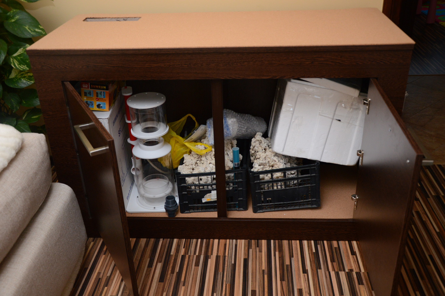 Szafka oklejona korkiem z bałaganem w środku