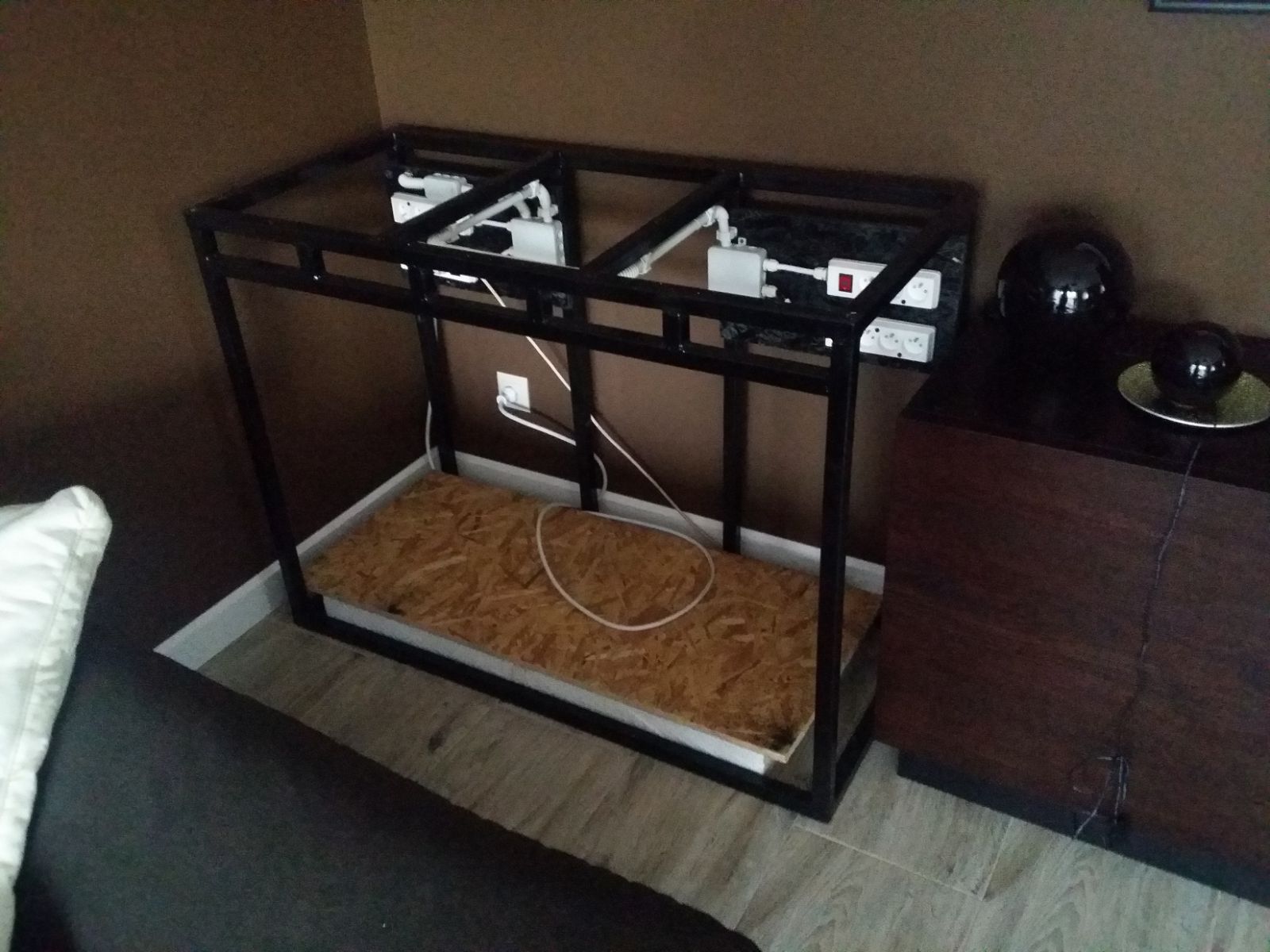 oraz blat pod akwarium, który wykonany został z płyty OSB 22 mm na to położyłem specjalną gąbkę pod akwarium, która ma za zadanie zmniejszyć naprężenia szyby oraz