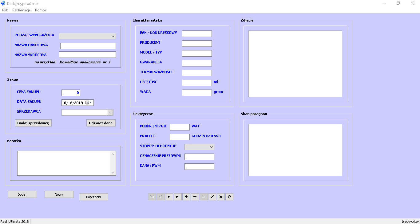 Dodawanie nowego wyposażenia, chemi, lamp i innych. Możliwość załączenia paragonu.